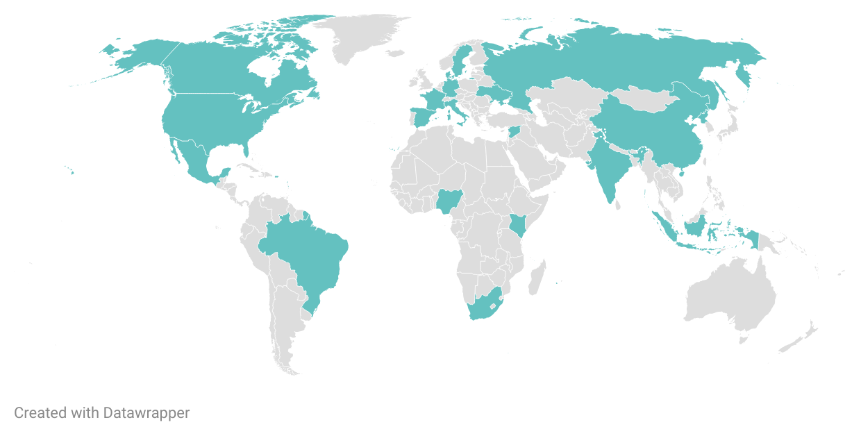 Media Cloud’s global scope allows for studies in nearly any country in the world, and multiple multi-national studies have been published. Studies have been published in multiple languages as well, including English, Italian, and French. The countries mentioned in paper titles, which is not exhaustive of regions studied, is visualized in Figure 3 below. Named regions are not visualized, though “Europe,” “Africa,” and “Latin America” were among the geographies listed in paper titles. The geographic range was quite broad, with every continent represented.